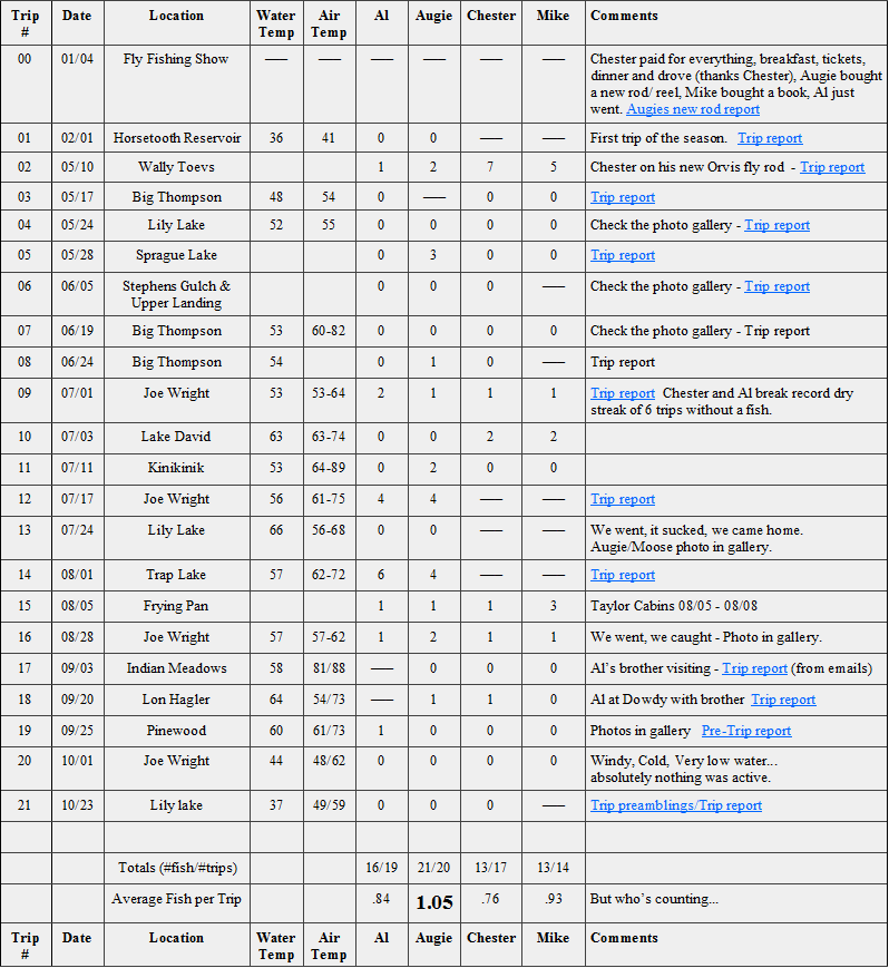 2012 was 87 person days fishing (Al 26, Augie 27, Chester 18, Mike 16) and caught a total of 194 fish which gives us the average of 2.23 fish per person per trip.