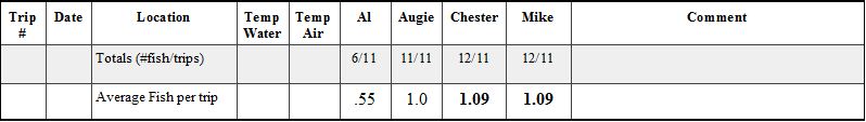 2011 was 50 person days fishing (Al 13, Augie 17, Chester 12, Mike 8) and caught a total of 106 fish which gives us the average of 2.1 fish per person per trip.