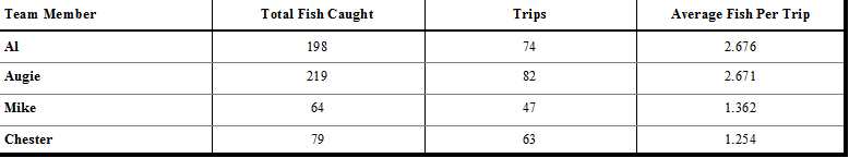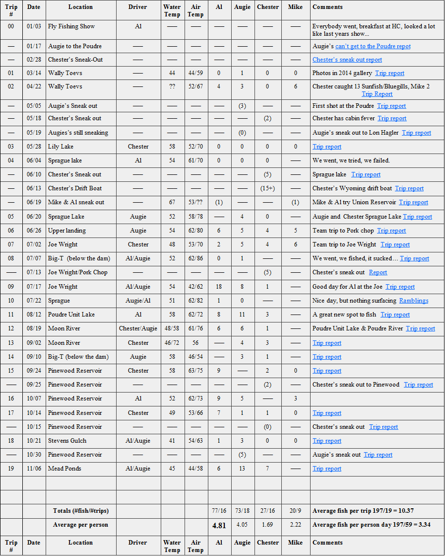 Since our inception, we have taken 84 trips, spent 266 person days and caught 561 fish for an average of 6.68 fish per trip or 2.1 fish per person per day.