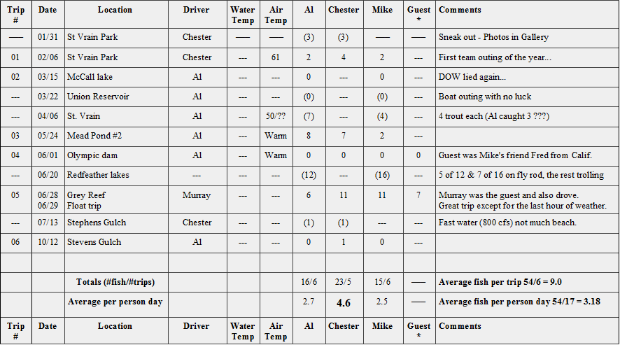 Since our inception, we have taken 133 trips, spent 425 person days and caught 1133 fish for an average of 8.52 fish per trip or 2.67 fish per person per day.