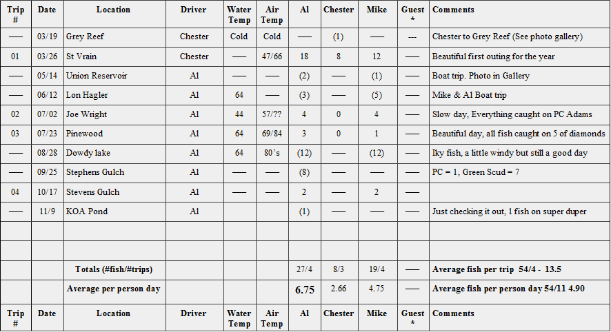 Since our inception, we have taken 141 trips, spent 448 person days and caught 1260 fish for an average of  8.9 fish per trip or 2.81 fish per person per day.