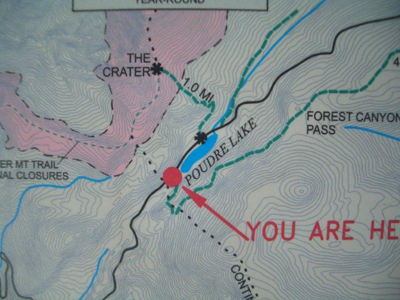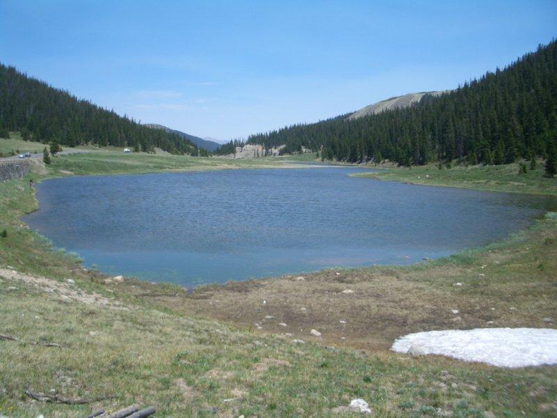 A report from Mike gave us the following description and pictures: Here it is guys. Not to blow the mystique of the wild and scenic Cache la Poudre, but at its source is this anemic lake. Now, it covers a pretty good area, but is no more than 6 inches deep at any point. The inlet is that small bit of snow in the lower right corner. The outlet crosses under the highway in a culvert. From there the "stream", which is a whopping 1 foot across, winds its way down the valley to eventually get measured in hundreds of CFM.... Now you know the 'Rest of the Story!'