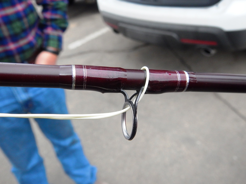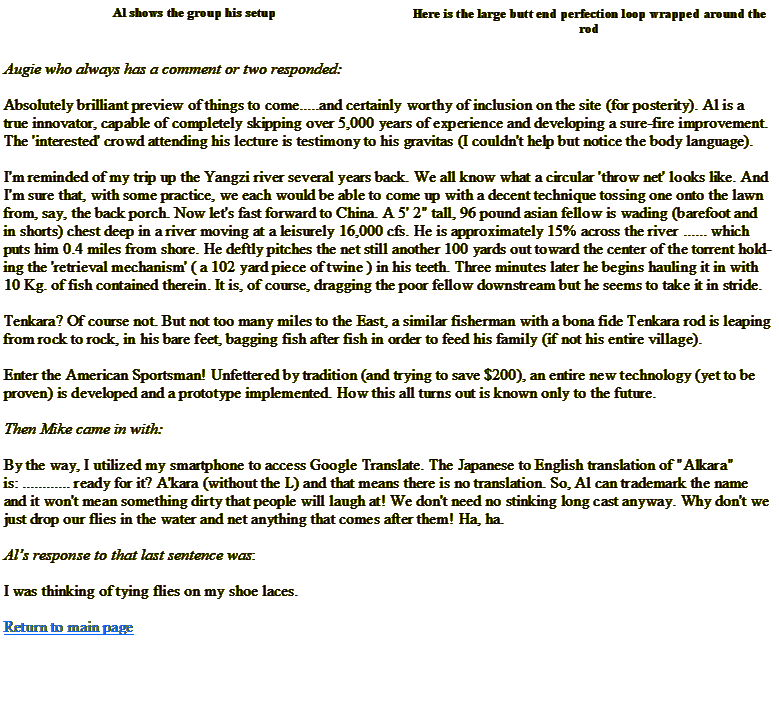 In truth, Al's Alkara rod is his old Courtland 6 weight fly rod with no attached reel. As you know, Al managed to mooch a 14 foot section of 5 weight fly line from Augie after our Royal Wok outing before last Wednesday's BAS club meeting. What Al has done is tied a large perfection loop on one end of the fly line and on the other end his tied a more petit perfection loop.