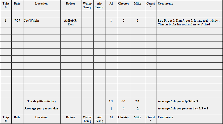 Since our inception, we have taken 145 trips, spent 460 person days and caught 1334 fish for an average of 9.2 fish per trip or 2.9 fish per person per day.